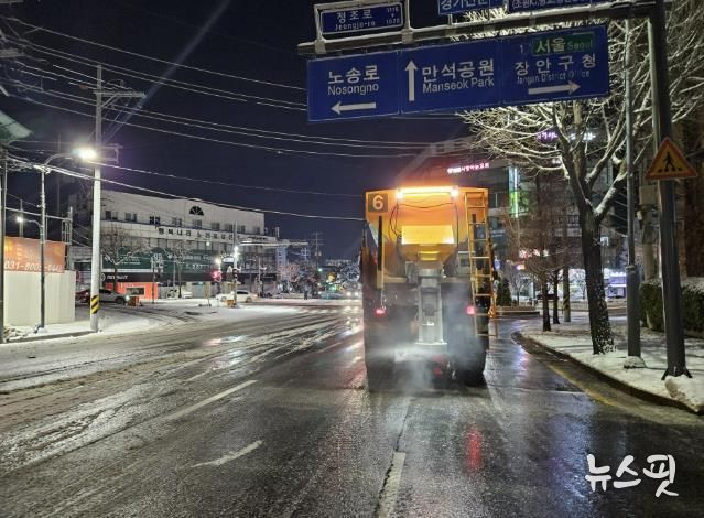 (뉴스핏 = 김호 기자) 4일 오후 1시부터 제설 비상근무 체계에 돌입했던 수원시(시장 이재준)가 제설 장비와 인력을 투입해 제설 작업에 총력을 기울이고 있다.