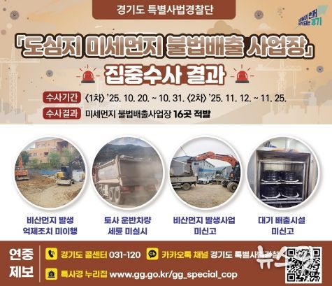 (뉴스핏 = 김수진 기자) 경기도는 도심지 미세먼지 발생사업장 330개를 대상으로 불법 배출 행위를 집중 수사해 대기환경보전법 위반 사업장 16개를 적발했다고 9일 밝혔다.