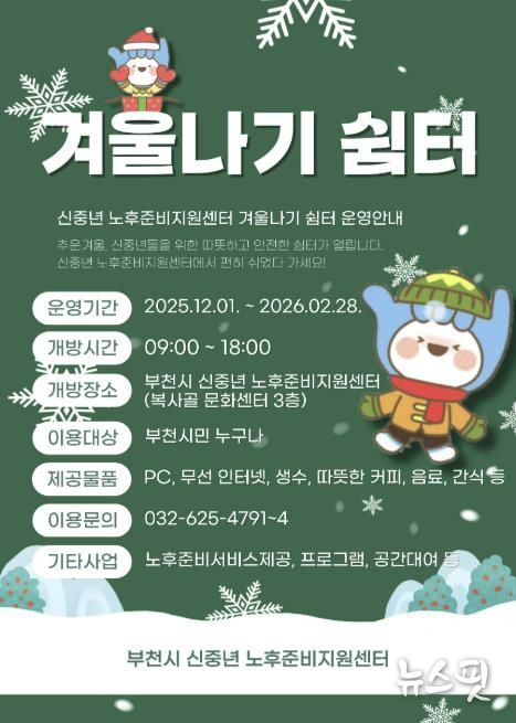 이소영 부천시 돌봄지원과장은 “겨울나기 쉼터는 시민들이 추위를 피해 따뜻하게 머물며 이웃과 자연스럽게 마주하고 소통할 수 있는 공간”이라며 “쉼터 이용이 노후준비 상담과 교육 등 다양한 서비스로 이어질 수 있도록 운영해 나가겠다”고 말했다.