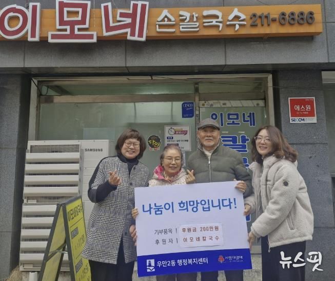 최영문 우만2동장은 “경기가 좋지 않음에도 해마다 후원을 이어오는 것이 결코 쉬운 일이 아니다”라며 “이모네칼국수의 따뜻한 나눔이 지역사회에 큰 울림을 주고 있으며, 홀몸어르신 복지 향상에 실질적인 도움이 되고 있다”고 감사의 뜻을 밝혔다.