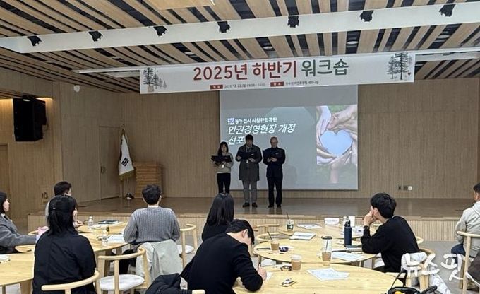 (뉴스핏 = 김호 기자) 동두천시 시설관리공단은 지난 22일 동두천 자연휴양림 세미나실에서 열린 2025년 하반기 워크숍에서 인권경영 헌장 개정 및 선포식을 개최했다고 밝혔다.