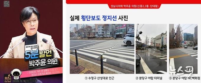 (뉴스핏 = 김수진 기자) 성남시의회 박주윤 의원(국민의힘, 신흥2·3동·단대동)은 12월 18일 열린 제307회 성남시의회 제3차 본회의 5분 발언에서 보행자의 생명과 직결된 ‘횡단보도 정지선 이격거리 확대 설치’의 시급성을 강조하며, 성남시의 적극적인 개선책 마련을 촉구했다.