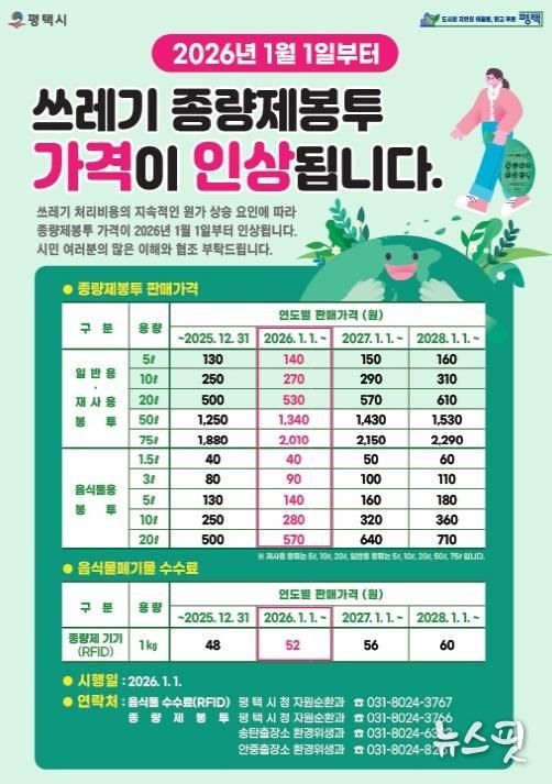 (뉴스핏 = 김수진 기자) 평택시는 2026년 1월 1일부터 쓰레기 종량제 봉투 가격을 3개년도에 걸쳐 인상한다.