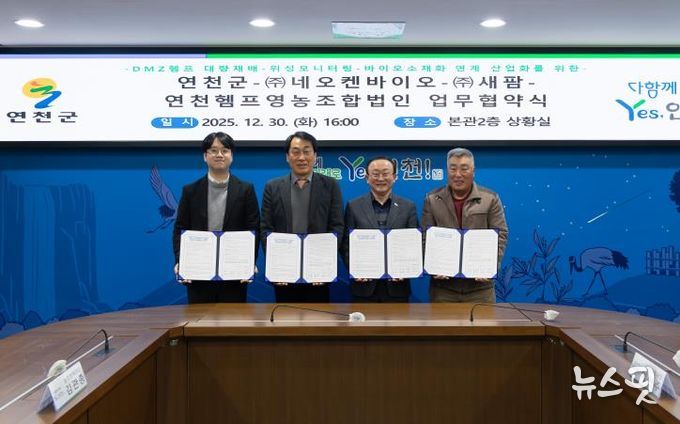 (뉴스핏 = 김호 기자) 연천군은 지난 30일 연천군청 본관 2층 상황실에서 ㈜네오켄바이오, ㈜새팜, 연천헴프영농조합법인과 함께 DMZ 지역 헴프(대마) 산업의 체계적 육성과 산업화를 위한 업무협약을 체결했다.