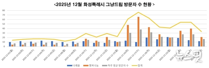 운영 초기인 ▲12월 1일부터 5일까지 하루 평균 이용자는 16명 수준이었으나, ▲12월 10일부터 12일까지는 20명대를 넘어서는 등 점차 증가세를 보였다. 이후 중반기인 ▲12월 16일부터 18일까지는 하루 평균 66명이 방문하며, 도입 초기 대비 4배 이상 증가한 수치를 기록했다. 특히, ▲12월 17일에는 하루 76명이 방문해 운영 이후 가장 많은 이용자 수를 기록했다.