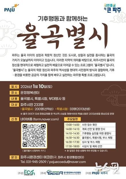 (뉴스핏 = 김수진 기자) 파주시환경센터 에코온은 파주를 대표하는 조선시대 사상가 율곡 이이의 학문 정신을 현대적 기후행동 가치로 재해석한 기후문화축제 ‘기후행동과 함께하는 율곡별시’를 오는 10일 운정행복센터에서 개최한다고 밝혔다.