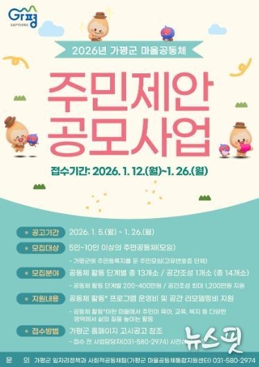 (뉴스핏 = 김호 기자) 가평군이 주민 주도의 마을공동체 활성화를 위해 ‘2026년 가평군 마을공동체 주민제안 공모사업’을 추진한다.