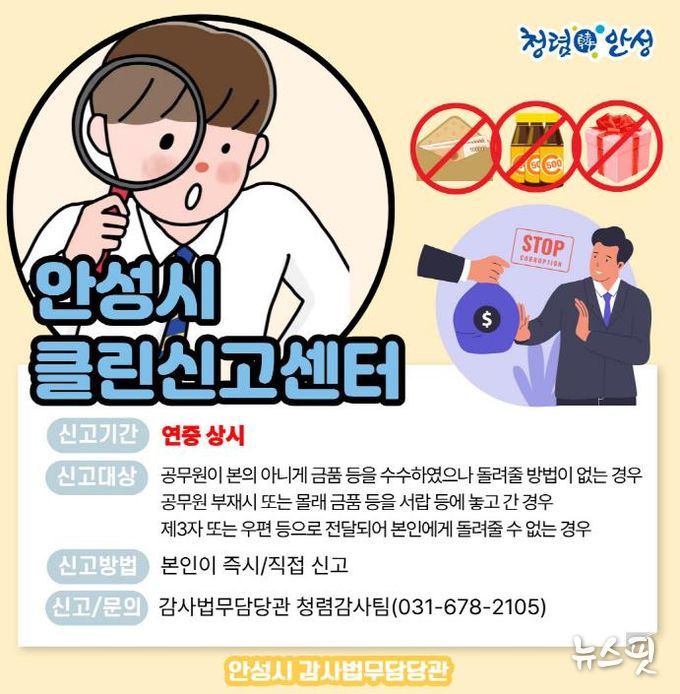(뉴스핏 = 김수진 기자) 안성시는 시민들에게 신뢰받는 공정하고 투명한 행정 서비스를 제공하기 위해 ‘클린신고센터’를 연중 상시운영하며 청렴한 행정문화 정착에 힘쓰고 있다고 7일 밝혔다.