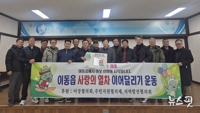 이동읍 이장협의회·주민지원협의체·지역발전협의회는 지난 6일 700만 원을 기탁하며 사랑의 열차 이어달리기 운동에 동참했다. 이동읍 주민지원협의체 김학목 회장은 “작년에 이어 올해도 사회복지공동모금회를 통한 용인시 사랑의 열차 이어달리기 운동에 동참하기로 뜻을 모았다”며 “앞으로도 따뜻한 지역사회 만들기를 위해 함께 노력해 나가겠다”고 했다.
