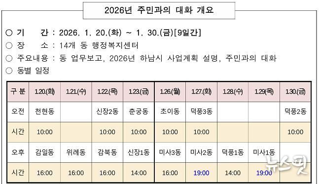 (뉴스핏 = 김호 기자) 하남시는 오는 20일부터 30일까지 관내 각 동 행정복지센터를 순회하며 ‘2026년 주민과의 대화’를 개최한다고 13일 밝혔다.