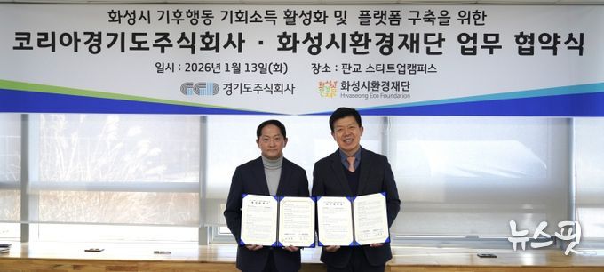 (뉴스핏 = 김수진 기자) 경기도주식회사는 13일 경기도 성남시 판교 스타트업캠퍼스에서 화성시환경재단과 ‘기후행동 기회소득 활성화 및 화성시 플랫폼 구축을 위한 업무협약’을 체결했다.
