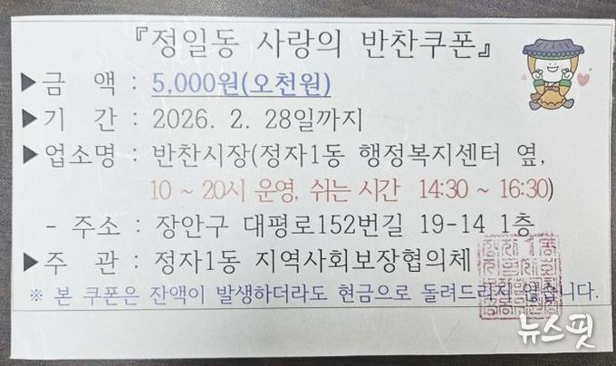 (뉴스핏 = 김호 기자) 수원시 장안구 정자1동 지역사회보장협의체는 금년부터 관내 취약계층 가구를 대상으로 매월 5가구에 2만원 상당의 반찬쿠폰을 지급하는 사업을 시작한다고 지난 13일 밝혔다.