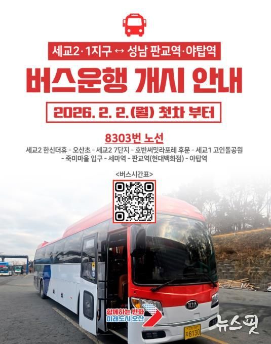 이번에 신설되는 8303번 버스는 하루 2대가 투입돼 총 8회 운행된다. 세교1·2지구를 비롯한 오산 주민들의 수도권 남부 이동 편의를 크게 높일 것으로 기대된다. 특히 성남 판교·야탑 방면 직행 노선에 대한 시민들의 지속적인 요구를 반영해 마련된 노선이라는 점에서 의미가 크다.