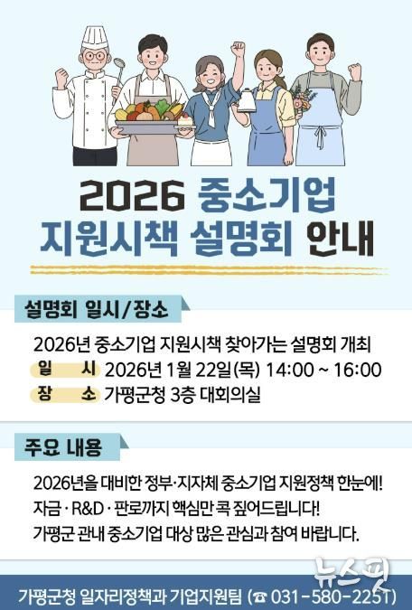 가평군은 관내 중소기업을 대상으로 ‘2026년 중소기업 지원시책 설명회’를 오는 22일 오후 2시 가평군청 3층 대회의실에서 개최한다고 밝혔다. 이번 설명회는 2026년도 중소기업 지원정책을 종합적으로 소개하는 한편 기업 현장의 애로사항을 직접 청취해 정책 수요에 반영하기 위해 마련됐다. 설명회에는 중소벤처기업진흥공단, 기술보증기금, 소상공인진흥공단, 경기중소벤처기업청 등 10개 기관이 참여한다.