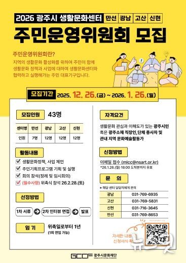 (뉴스핏 = 김수진 기자) (재)광주시문화재단은 광주시 생활문화센터(만선·광남·고산·신현)에서 2026년에 활동할 주민운영위원회 위원을 통합 공개 모집한다고 밝혔다.