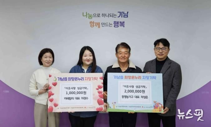 (뉴스핏 = 김호 기자) 여주시 가남읍 행정복지센터은 지난 15일, 관내 사업체인 동명농기구와 카페 발리에서 지역 내 취약계층을 위한 이웃돕기 성금을 기탁했다고 밝혔다.