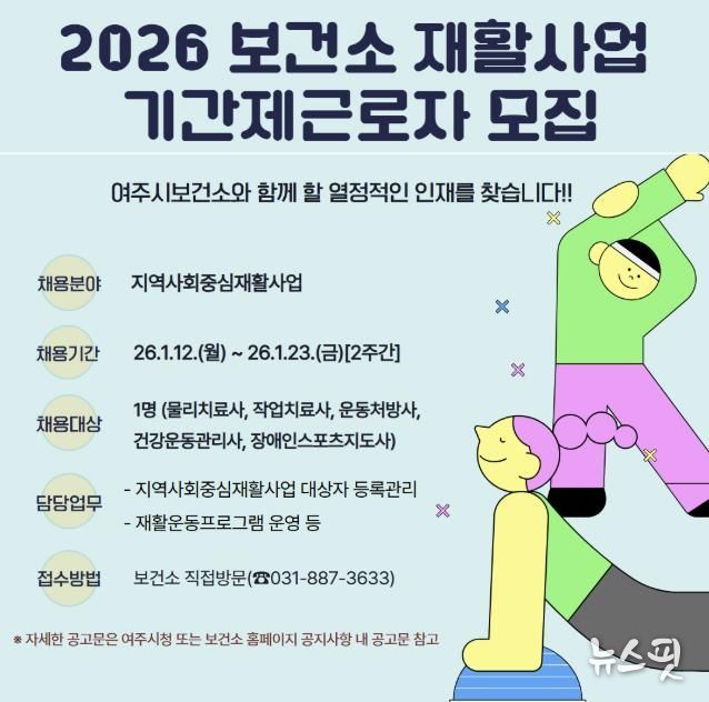 (뉴스핏 = 김호 기자) 여주시보건소는 지역 내 등록장애인과 예비장애인들의 건강관리를 위한 지역사회중심재활사업 추진을 위해 1월 12일부터 1월 23일까지 2주간 기간제근로자 채용 공고를 실시한다.