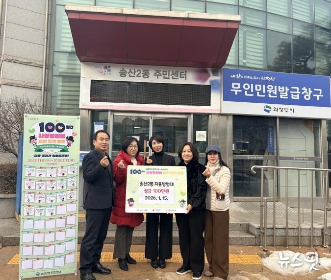 (뉴스핏 = 김호 기자) 의정부시 송산2동주민센터는 1월 15일 송산2동 자율방범대가 ‘100일간 사랑릴레이 배턴 잇기’의 일환으로 성금 100만 원을 기탁했다고 밝혔다.