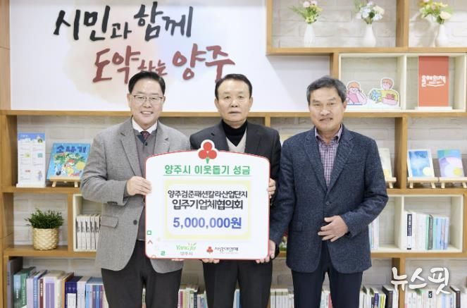 (뉴스핏 = 김호 기자) 양주시가 지난 15일 시장실에서 양주검준패션칼라사업협동조합을 비롯한 관련 단체 및 기업으로부터 이웃돕기 성금과 성품을 기탁받았다고 밝혔다.