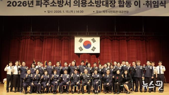 (뉴스핏 = 김수진 기자) 파주소방서는 1월 15일 파주시민회관 대공연장에서 『2026년 파주소방서 의용소방대 대장 합동 이·취임식』을 열고, 지역 안전을 위해 헌신해온 이임 대장들의 공로에 감사를 전하는 한편, 새로운 리더들과 함께 ‘의용’의 사명을 이어갈 뜻을 다졌다.