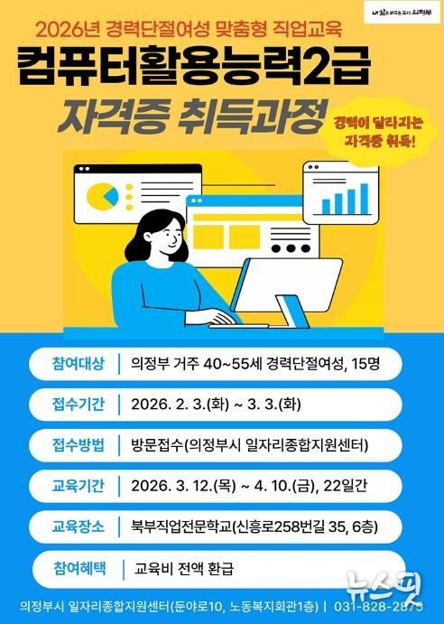 (뉴스핏 = 김호 기자) 의정부시는 경력단절여성의 취업역량 강화를 위해 2월 3일부터 3월 3일까지 ‘컴퓨터활용능력2급 자격증 취득과정’ 참여자를 모집한다.