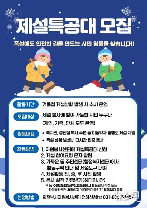(뉴스핏 = 김호 기자) 의정부시는 겨울철 폭설로 인한 시민 불편을 최소화하고 안전한 보행환경을 조성하기 위해 ‘제설특공대’를 모집한다.