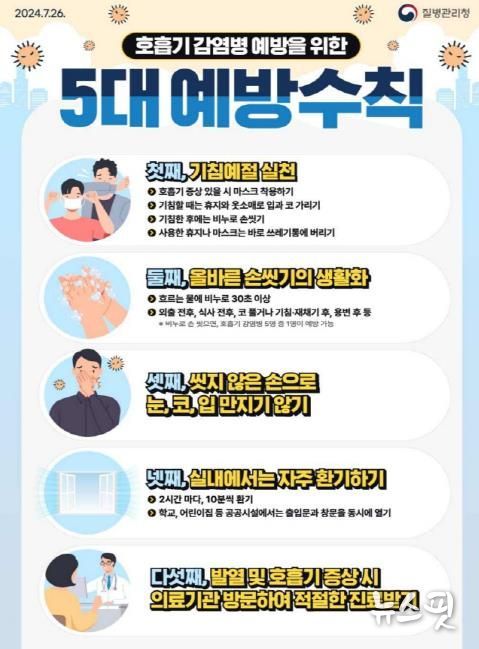 호흡기 감염병의 발생과 전파 예방을 위해서는 △ 접종 시기에 맞춰 예방접종 실시 △ 흐르는 물에 30초 이상 올바른 손씻기 △ 기침할 때 옷소매로 입과 코 가리기 △ 실내에서 자주 환기하기 △ 증상 발생 시 의료기관 방문해 진료받기 등 예방수칙을 준수하는 것이 중요하다.