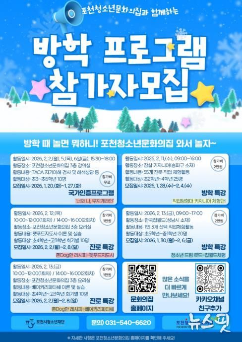 프로그램은 2026년 2월 2일부터 13일까지 포천청소년문화의집과 각 활동처에서 진행되며, 초등학생부터 중·고등학생까지 참여할 수 있다. 일부 프로그램은 무료로 운영되며, 진로 특강과 직업 체험 과정은 소정의 참가비가 있다.