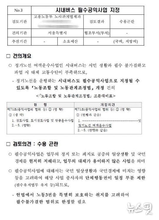 버스노동자들은 “필수공익사업 지정은 헌법이 보장한 노동3권 가운데 단체행동권을 직접적으로 제한하는 제도”라며 “위헌 소지가 끊이지 않아 철폐돼야 할 악법임에도, 서울시는 시대를 역행하는 법 개정에 나서고 있다”고 비판했다. 이어 “이는 서울시버스노동조합의 정당한 파업 과정에서 드러난 행정 무능을 가리기 위한 책임 회피에 불과하다”고 주장했다.