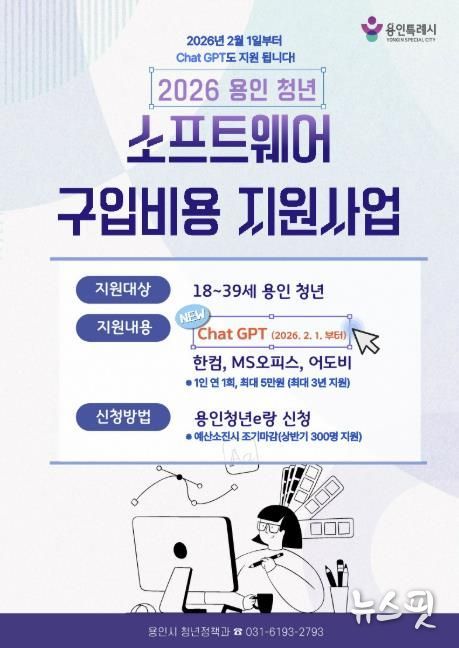 (뉴스핏 = 김수진 기자) 용인특례시는 청년들의 디지털 역량 강화를 위해 ‘청년 소프트웨어 구입비용 지원사업’ 대상 품목에 ‘ChatGPT Plus’를 추가했다고 2일 밝혔다.