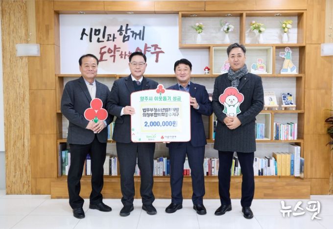 (뉴스핏 = 김호 기자) 양주시는 지난 30일 시장실에서 법무부청소년범죄예방 의정부협의회 양주지구로부터 이웃돕기 성금 200만 원을 기탁받았다고 밝혔다.
