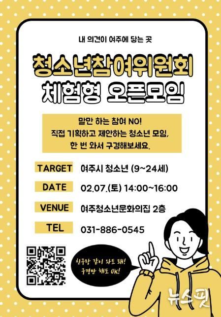 모집 대상은 여주시에 거주하거나 재학 중인 9세~24세 청소년이며, 모집 기간은 2월 18일까지이다. 선발된 위원들은 월 1회 정기회의 및 분과활동을 비롯해 정책 제안, 행사 기획, 청소년 사업 모니터링, 다른 지역 청소년참여위원회와의 교류 활동 등에 참여하게 된다.