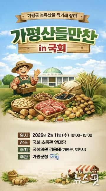 (뉴스핏 = 김호 기자) 설 명절을 앞두고 가평군의 우수 농특산물을 한자리에서 만날 수 있는 직거래 장터가 국회에서 열린다. 소비자와 생산자를 직접 연결하는 이번 행사는 도시민들에게 가평 농산물의 우수성과 가평의 관광자원까지 함께 알리는 자리가 될 전망이다.