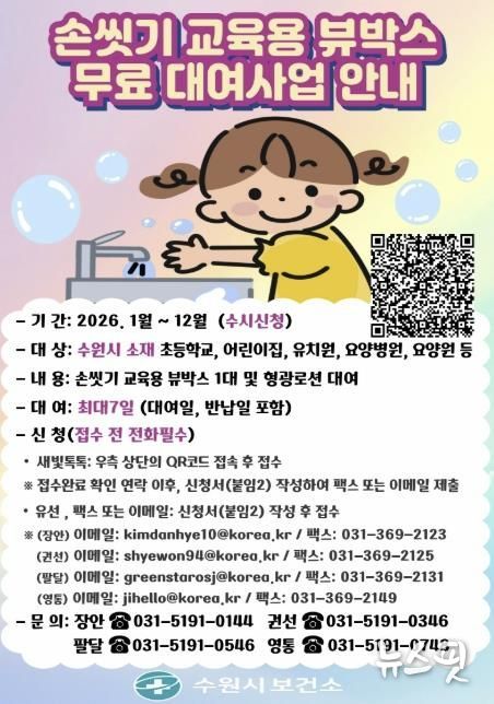 (뉴스핏 = 김호 기자) 수원시보건소가 교육용 손씻기 체험 기구인 ‘뷰박스(View-box)’를 무료로 대여한다.