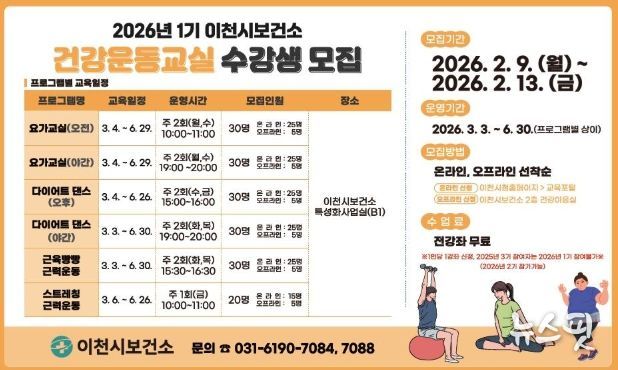 (뉴스핏 = 김수진 기자) 이천시보건소는 시민들이 건강생활을 실천할 수 있도록 ‘2026년 건강운동교실 1기’ 참여자를 선착순으로 모집한다고 5일 밝혔다.