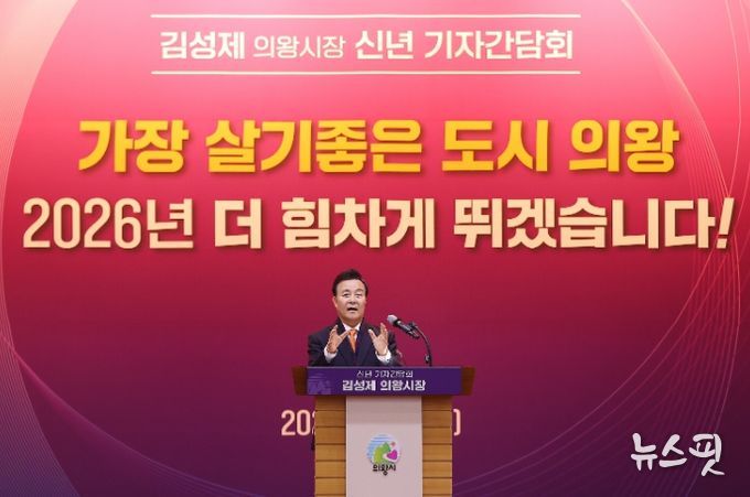 (뉴스핏 = 김수진 기자) 김성제 의왕시장이 5일 시청 대회의실에서 2026년 신년 기자간담회를 열고 민선8기 의왕시 주요성과와 2026년 시정 운영방향에 대해 설명하는 시간을 가졌다.
