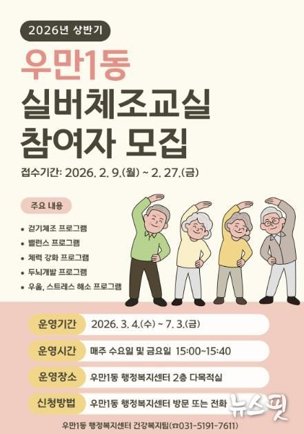 (뉴스핏 = 김호 기자) 수원시 팔달구 우만1동은 관내 어르신들의 건강 증진을 위해 2월 9일부터 2월 27일까지 ‘2026년 상반기 실버체조교실’ 참여자를 선착순으로 모집한다고 밝혔다.