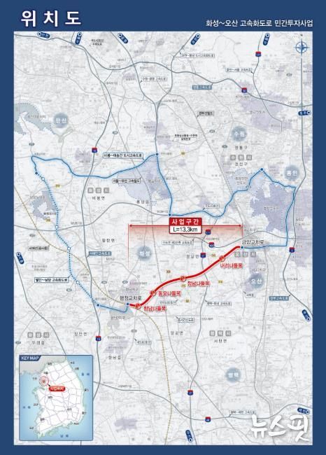 이 사업은 화성시 향남읍에서 오산시 금암동까지 약 13.3km 구간을 연결하는 왕복 4차로 자동차전용도로를 건설하는 것으로, 개통 시 수도권 서남부 지역의 교통 혼잡 해소와 이동 시간 단축, 산업·주거지역 접근성 개선에 크게 기여할 것으로 기대된다.