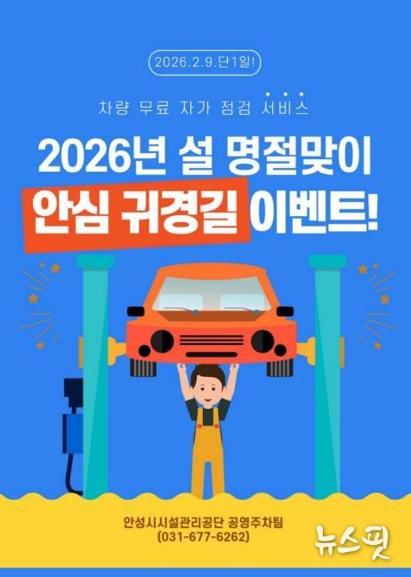 (뉴스핏 = 김수진 기자) 안성시시설관리공단은 오는 2월 9일 오전 10시부터 아양지구 제2공영주차장(경기도 안성시 옥산동546)에서 2026년 설 명절을 맞이하여 공영주차장 이용객과 지역 주민을 대상으로, 차량 무료 자가 점검 서비스 ‘안심 귀성길’캠페인을 추진한다고 밝혔다.
