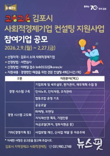 (뉴스핏 = 김수진 기자) 김포시가 관내 사회적경제기업의 지속 가능한 성장과 자생력 강화를 위해 ‘사회적경제기업 역량강화 컨설팅 지원사업’ 참여기업을 오는 2월 27일까지 모집한다.