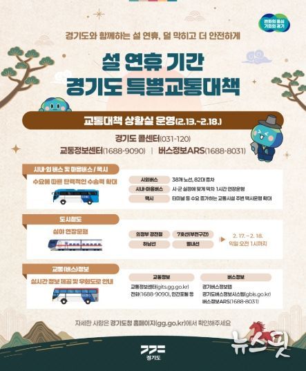 (뉴스핏 = 김수진 기자) 경기도가 안전하고 편한 설 귀성길 조성을 위해 13일부터 18일까지 6일간을 ‘2026년도 설 연휴 특별교통대책기간’으로 정하고 시외버스 증차, 도로정보 실시간 안내, 긴급도로 복구 체계 구축 등 적극 대응한다.