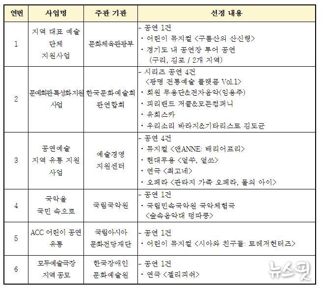 이번에 선정된 사업은 ▲지역 대표예술단체 지원 사업(문화체육관광부) ▲문예회관 특성화 지원 사업(한국문화예술회관연합회) ▲공연예술 지역 유통 지원 사업(예술경영지원센터) ▲지역 문화향유기회 확대를 위한 '국악을 국민 속으로'(국립국악원) ▲ACC 어린이 공연 유통(국립아시아문화전당재단) ▲모두예술극장 지역 공연 공모(한국장애인문화예술원)이다.