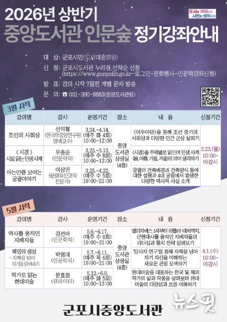 (뉴스핏 = 김수진 기자) 군포시중앙도서관은 시민의 인문학적 소양을 함양하고 공동체적 성찰의 기회를 확대하고자 ‘중앙도서관 인문숲’ 상반기 강좌를 운영한다.