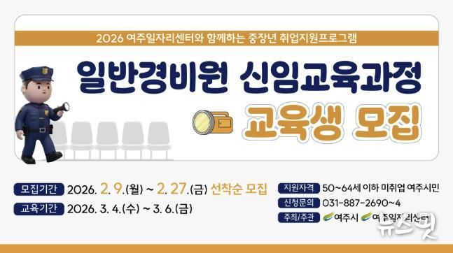 (뉴스핏 = 김호 기자) 여주시는 중장년층의 재취업을 돕기 위해 2026년 여주시 중장년 일반경비원 신임교육과정 교육생을 모집한다고 10일 밝혔다.