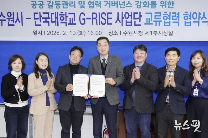 양 기관은 10일 수원시청에서 공공 갈등관리 분야 교류협력 협약을 체결하고 협력을 약속했다. 협약식에는 김현수 수원특례시 제1부시장, 김오영 단국대학교 지-라이즈(G-RISE) 사업단장 등이 참석했다.