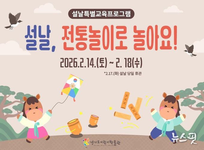 (뉴스핏 = 김수진 기자) 경기문화재단 경기도어린이박물관은 설날을 맞이하여 2026년 2월 14일부터 2월 18일까지 설날 특별프로그램 '설날, 전통놀이로 놀아요!'를 운영한다. 설 연휴 동안 박물관을 방문하는 어린이와 동반 가족을 위해 가족 간의 유대감을 높일 수 있는 전통문화 체험프로그램 3종을 준비했다.