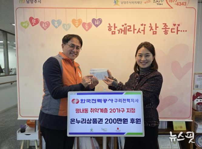 (뉴스핏 = 김호 기자) 남양주시는 지난 9일 한국전력공사 구리전력지사가 설 명절을 맞아 평내동 취약계층 지원을 위해 온누리상품권 200만 원을 동부희망케어에 전달했다고 밝혔다.