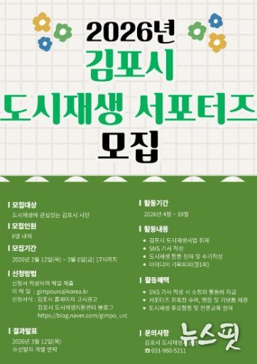 (뉴스핏 = 김호 기자) 김포시는 다양한 도시재생사업을 홍보하고 도시재생에 대한 시민들의 이해와 관심을 도모하고자 오는 12일부터 ‘2026년 김포시 도시재생 서포터즈’를 모집한다.