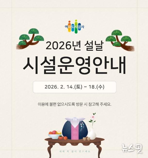 (뉴스핏 = 김호 기자) 여주도시공사가 다가오는 2026년 설 연휴를 맞아 시민과 귀성객들이 안전하고 편안한 명절을 보낼 수 있도록 주요 시설 운영시간 조정 및 특별 서비스를 시행한다고 13일 밝혔다.