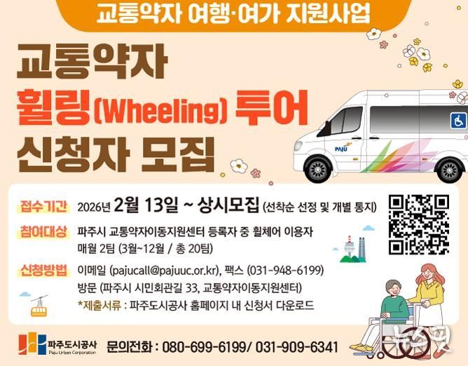 (뉴스핏 = 김호 기자) 파주시 교통약자이동지원센터는 교통약자의 이동권 확대와 여가 활동 증진을 위해 '교통약자 휠링(Wheeling) 투어 지원사업'을 3월부터 본격 운영한다고 밝혔다.